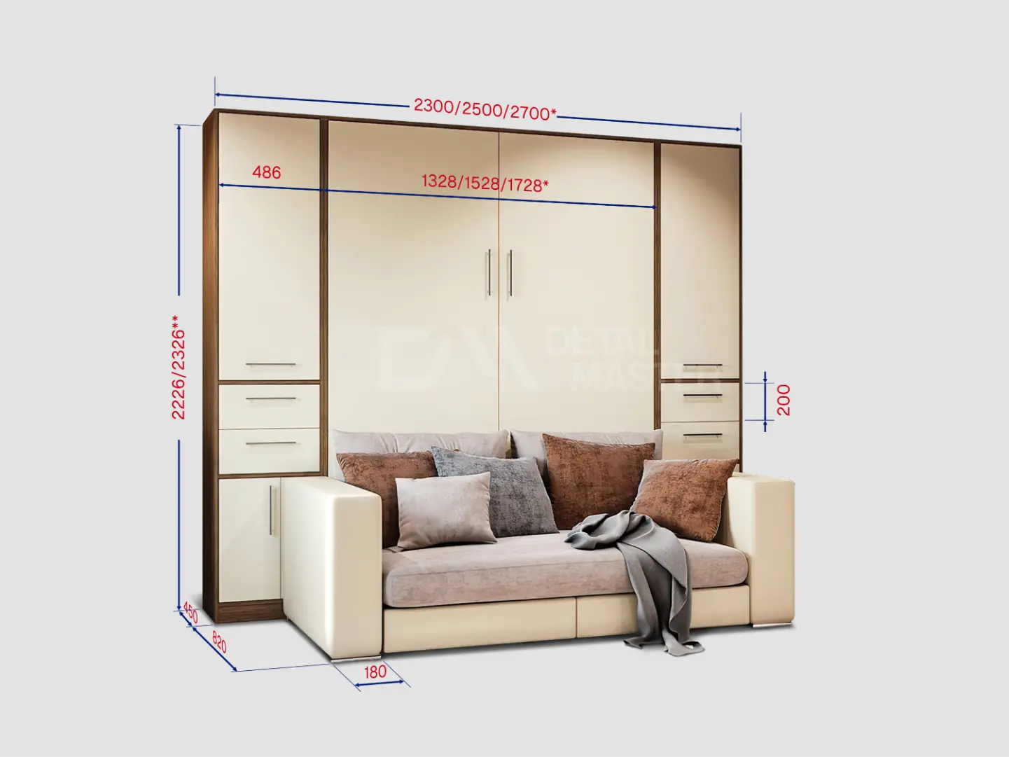 Дополнительные опции, такие как: освещение, зарядное устройство, розетки, мягкое изголовье, матрас - не входят в стоимость шкаф-кровати "Extra Start". Вы всегда можете их добавить в опциях или написав менеджеру при оформлении заказа.